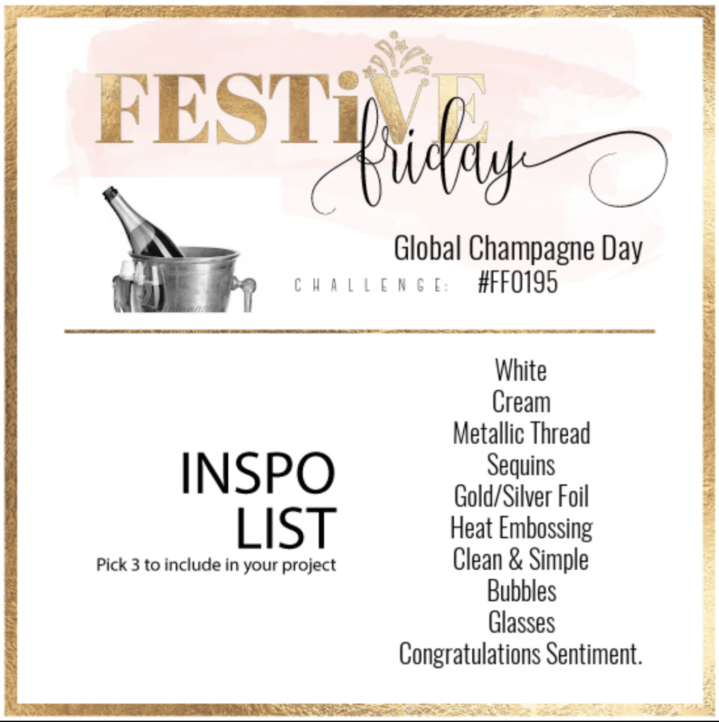 What a great challenge and the Inspo List is geared to the Global Champagne Day Did you know there was such a day?  It is held on October 24 and is dedicated to the Bubbly Devil’s Wine. Interesting right?